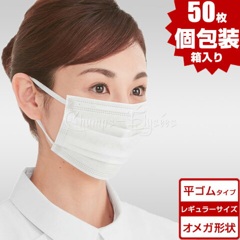 マスク 50枚 日本製 に負けない 個包装 平ゴム オメガ形状 箱 白 国内発送 送料無料 即納 6mm幅 3層 大人 レギュラー サイズ 男女兼用 使い捨て 三層構造 平紐 平ひも 耳が痛くない 痛くなりにくい オメガ プリーツ 不織布マスク ホワイト 立体 大人用 在庫あり あす楽