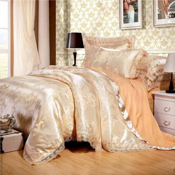豪華 シルク調ベッドカバー4点セット ユーロデザイン 輸入取寄せ品 シルク寝具セット布団カバー(1)フラットシーツ(1)枕カバー(2) Color-1