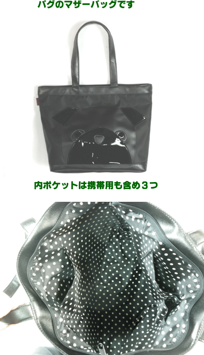 遠目には黒いトートバッグでも近くではパグの顔がドアップと言うパグ好きには堪らないトートバッグでプレゼントやギフトとしても最適です。