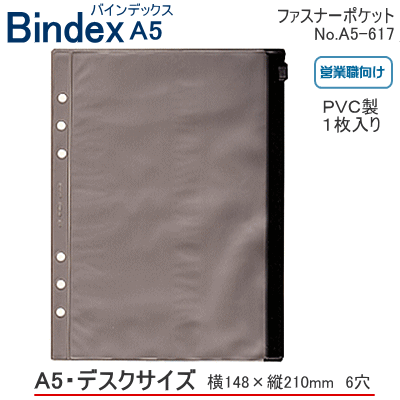 商品名 Bindex バインデックス ファスナーポケット A5サイズ システム手帳 リフィル リフィール 品番 A5-617 サイズ 横148×縦210mm (A5サイズ、デスクサイズ 6穴) 入数 1枚入 仕様 PVC製 メーカー JMAM 日本能率協会マネジメントセンター ※A5サイズのリフィルですサイズ違いには十分ご注意ください。